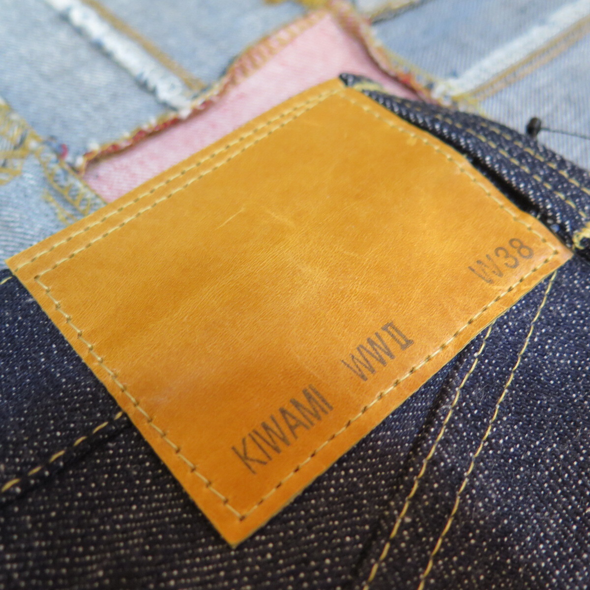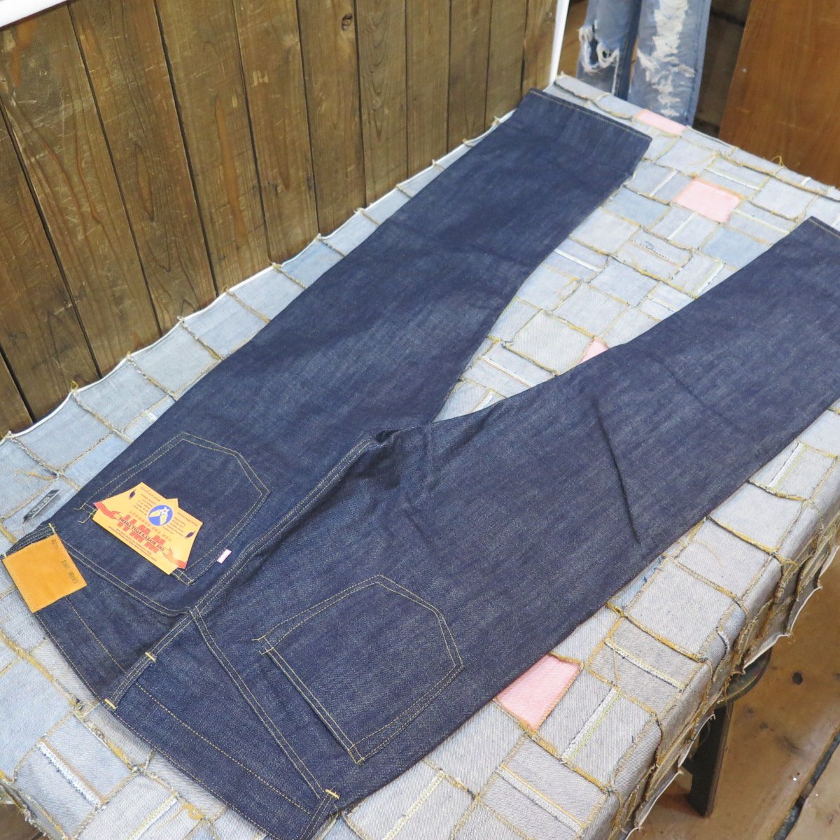 レザーパッチ・片面赤タブ・各所当時同様の切りっぱなし縫製・ポケット裏耳無し