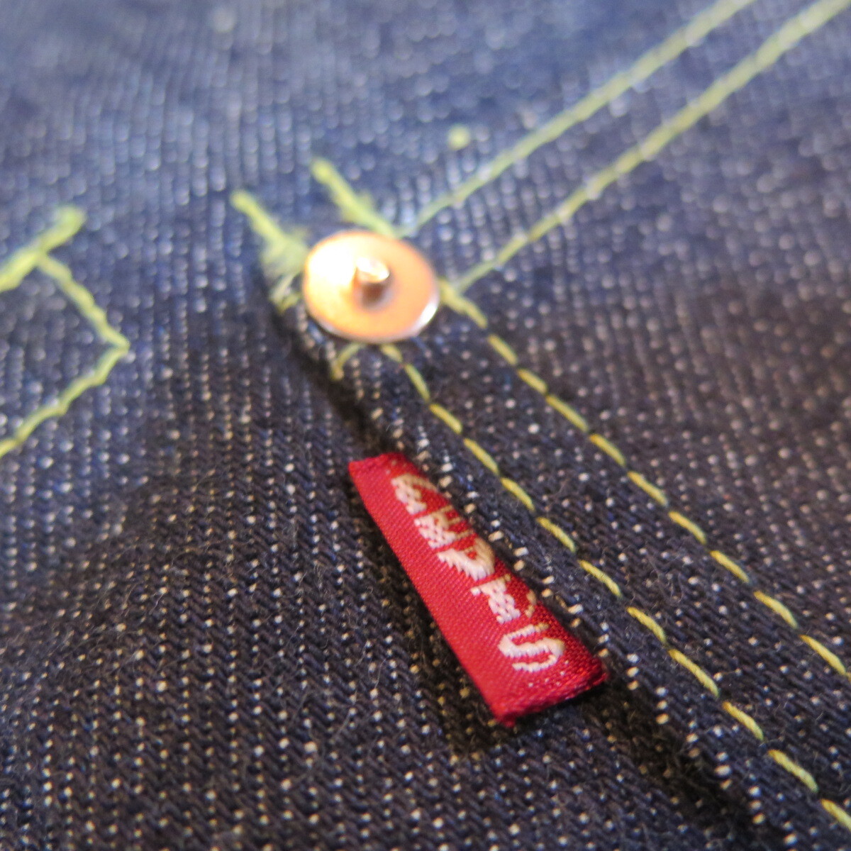 オールバナナイエロー糸・レザーパッチ・レーヨン片面赤タブ・ガチャ縫いプリーツステッチ