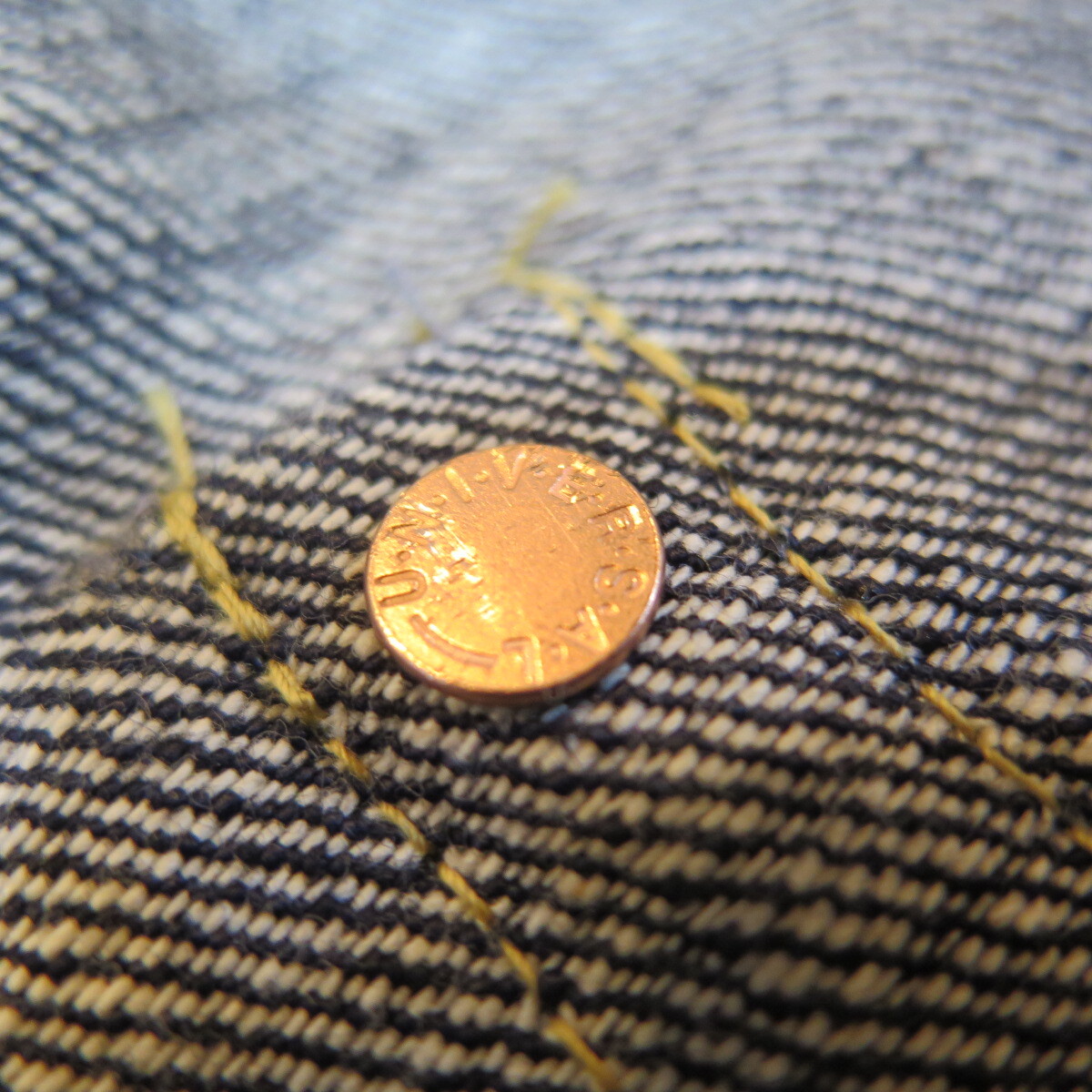 レザーパッチ・赤タブ・鉄製ロゴボタン(打痕跡ツープロング)・銅リベット・ポケット裏耳あり