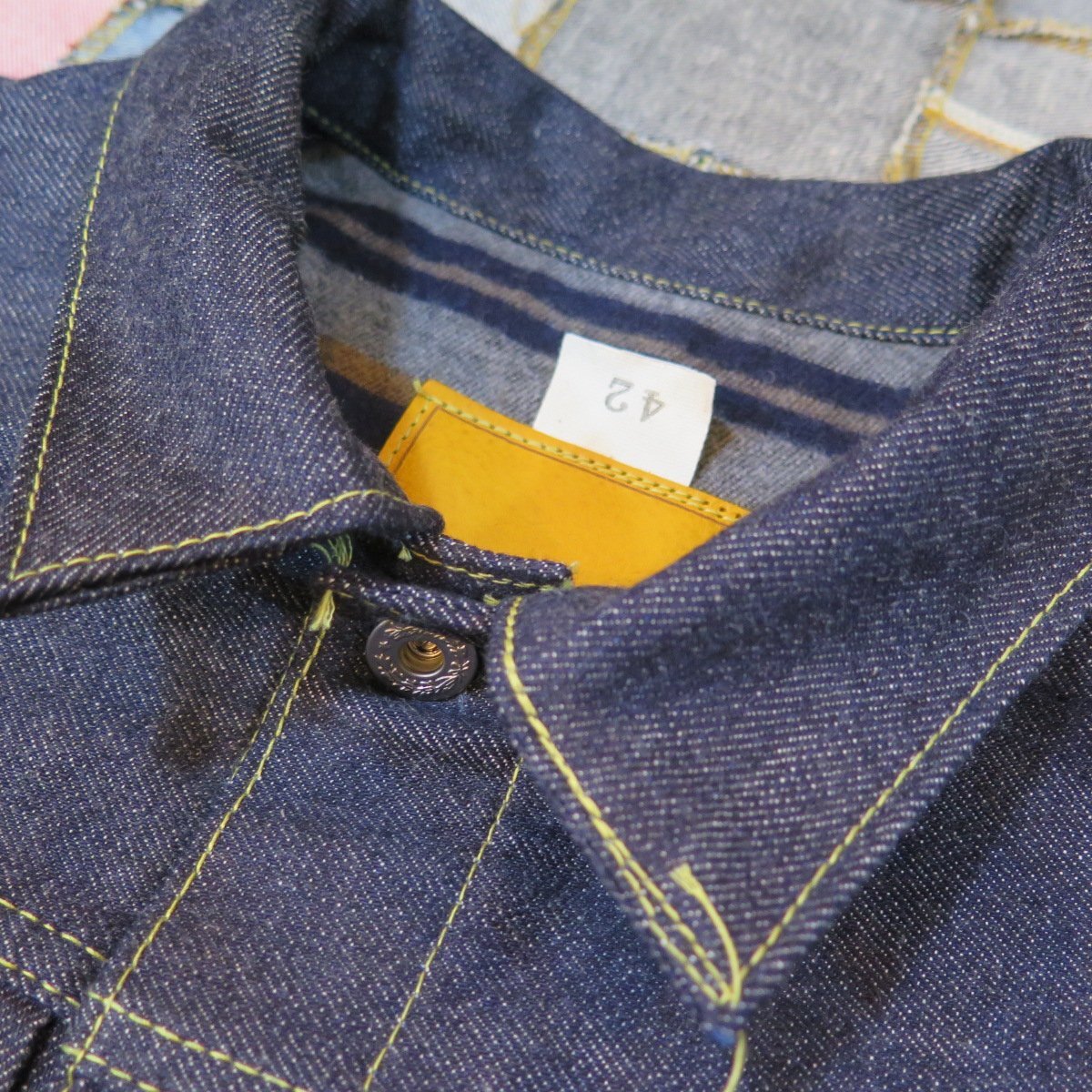 オールバナナイエロー糸・レザーパッチ・レーヨン片面赤タブ・ベロ下がり・ガチャ縫いプリーツステッチ