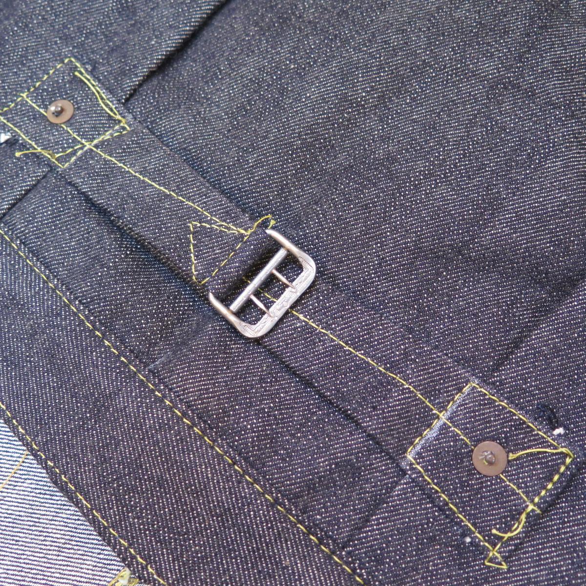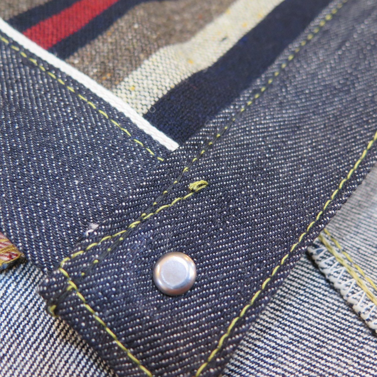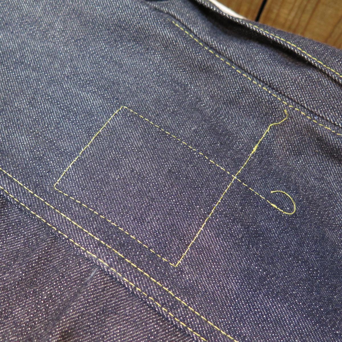 戦争下の大変な時に生まれたいわゆる大戦デニムのスーパーイレギュラーをビンテージミシンを使い再現+裏地付き。