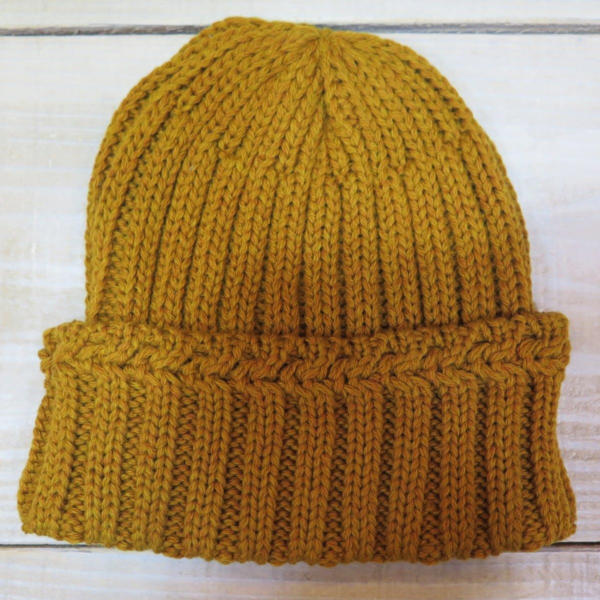 伸縮性を考慮した適度に浅めな帽体、折り返し部の端は編み立てがアクセントになります。