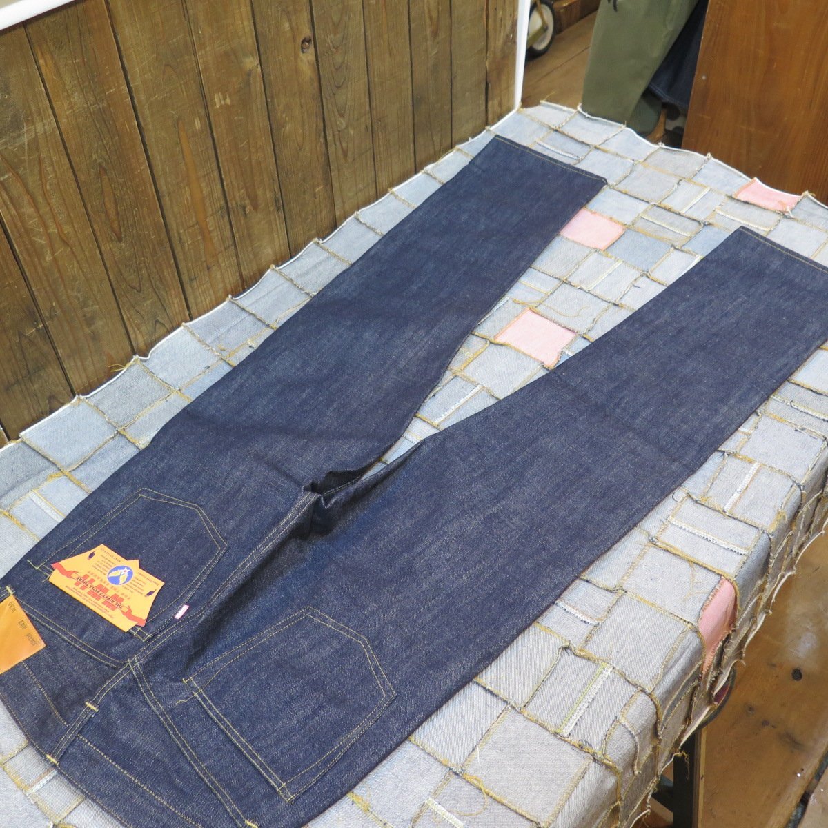 レザーパッチ・片面赤タブ・各所当時同様の切りっぱなし縫製・ポケット裏耳無し