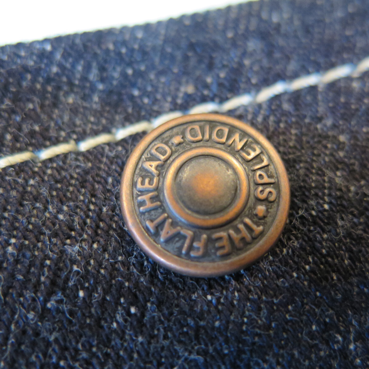 開口部にはブランドロゴ入りのオリジナルドットボタン、サイドポケット部分には旧式シャトル織機で織り上げられた証でもある生地のミミ(端の部分)を使用。