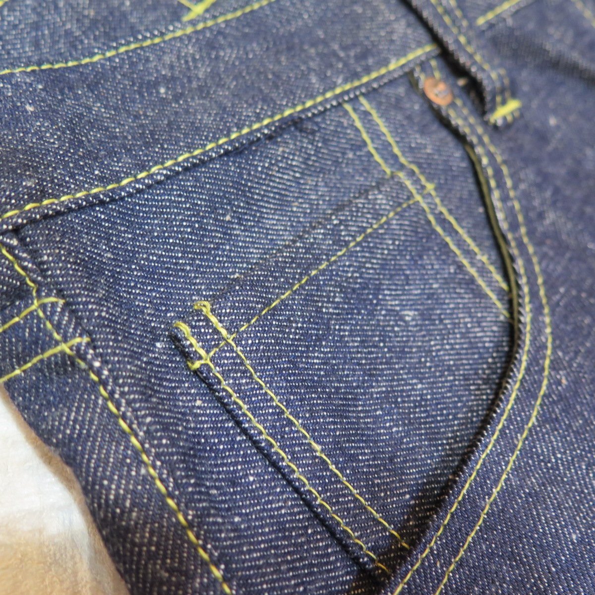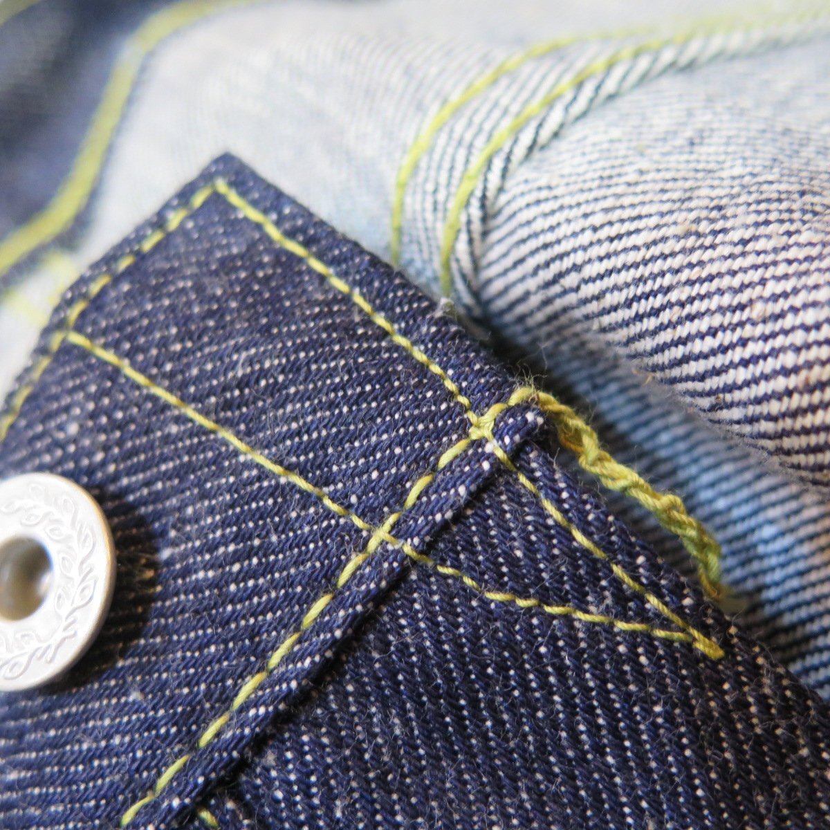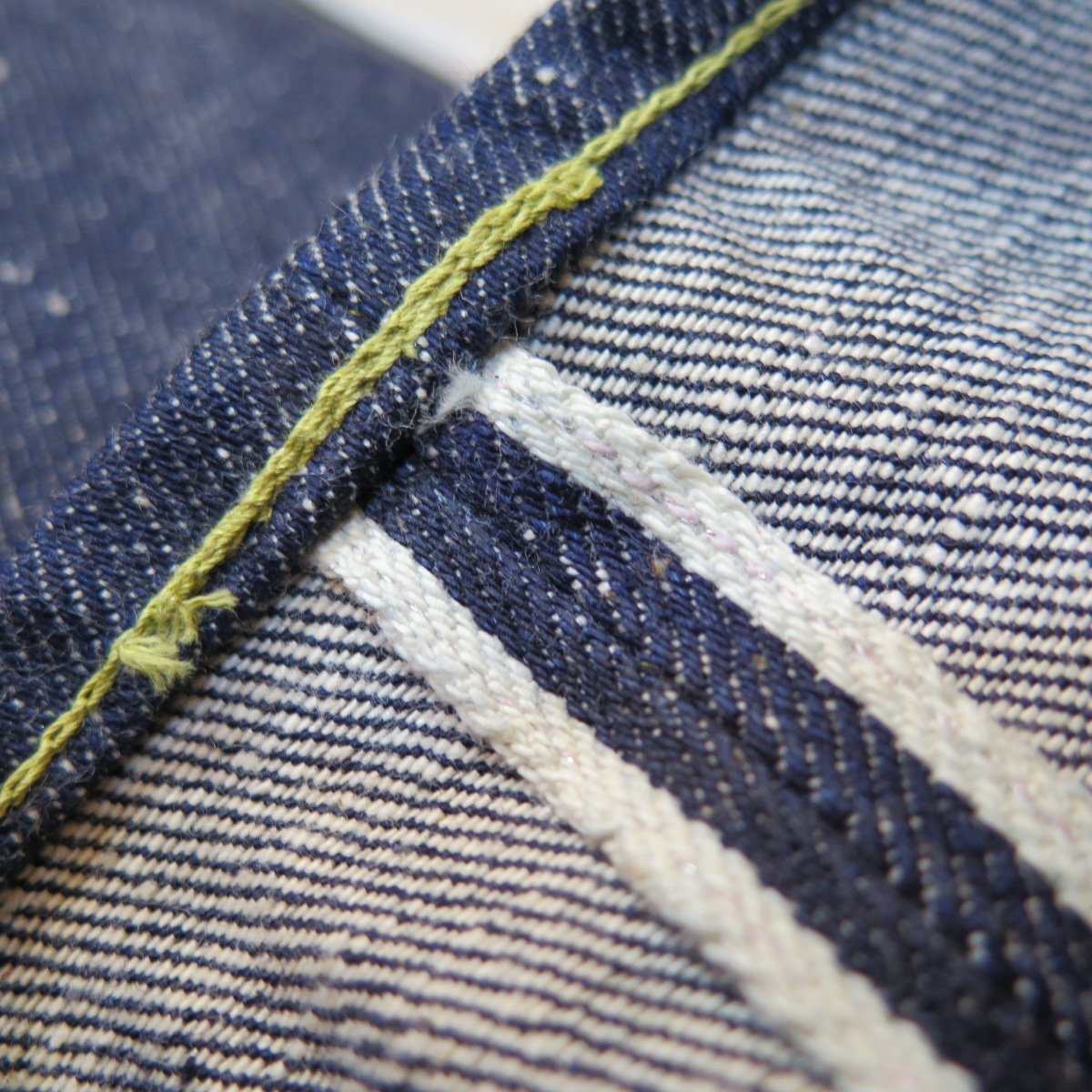 糸は経に6番のムラ糸、染めは当時のデニムのイメージでやや青の強い深みのあるインディゴに染め上げています。