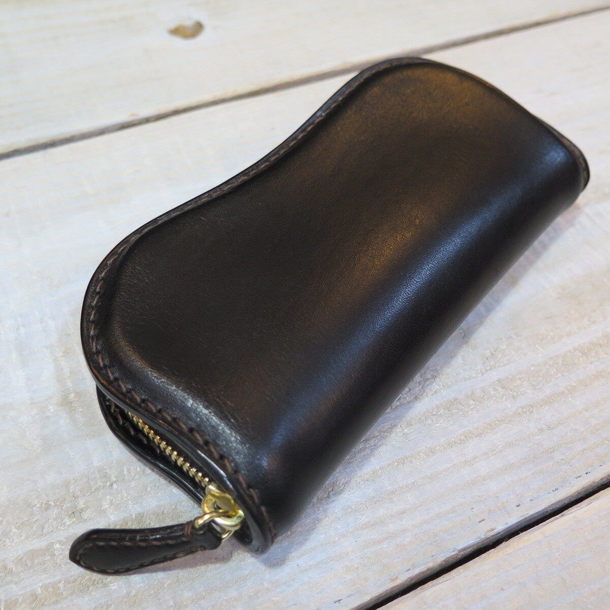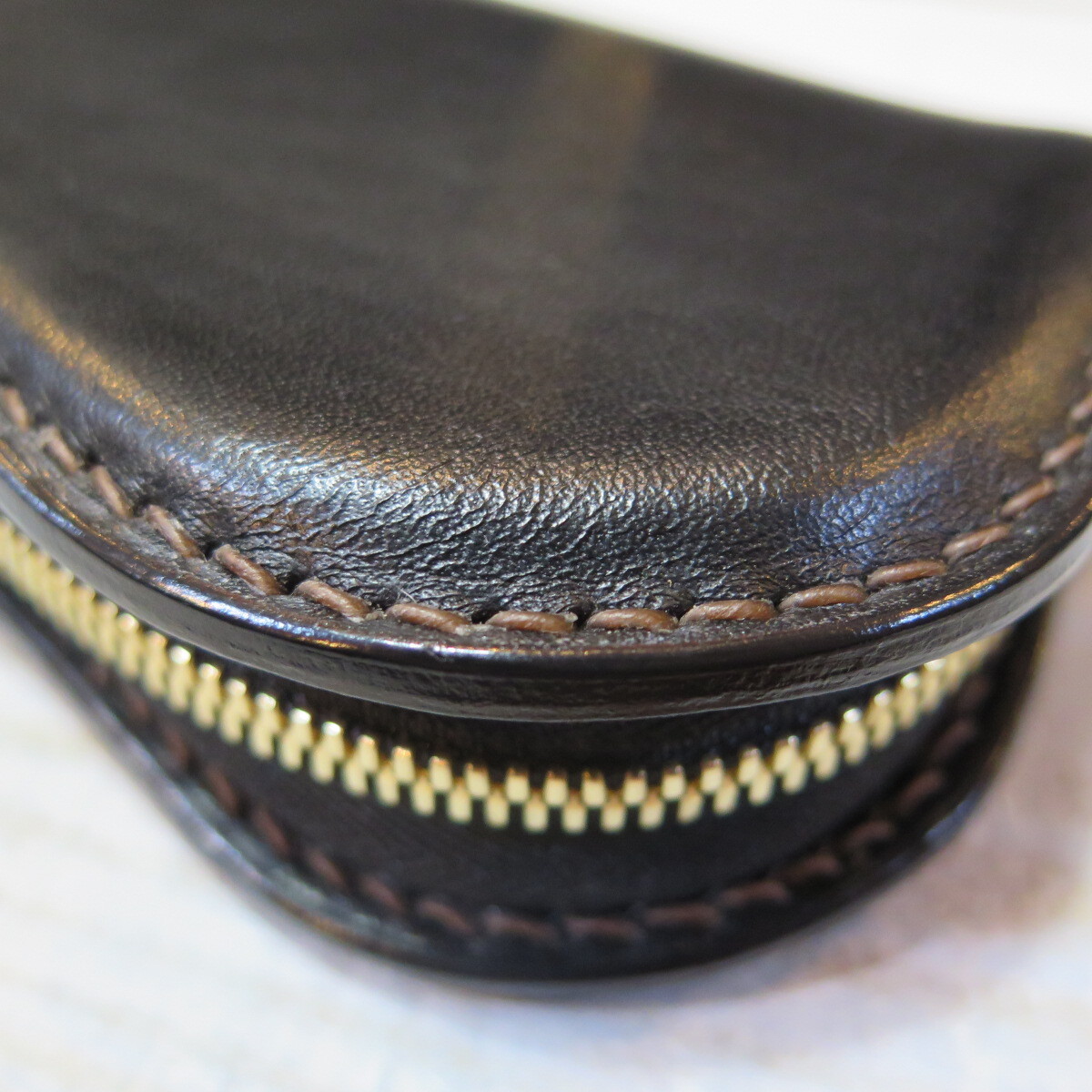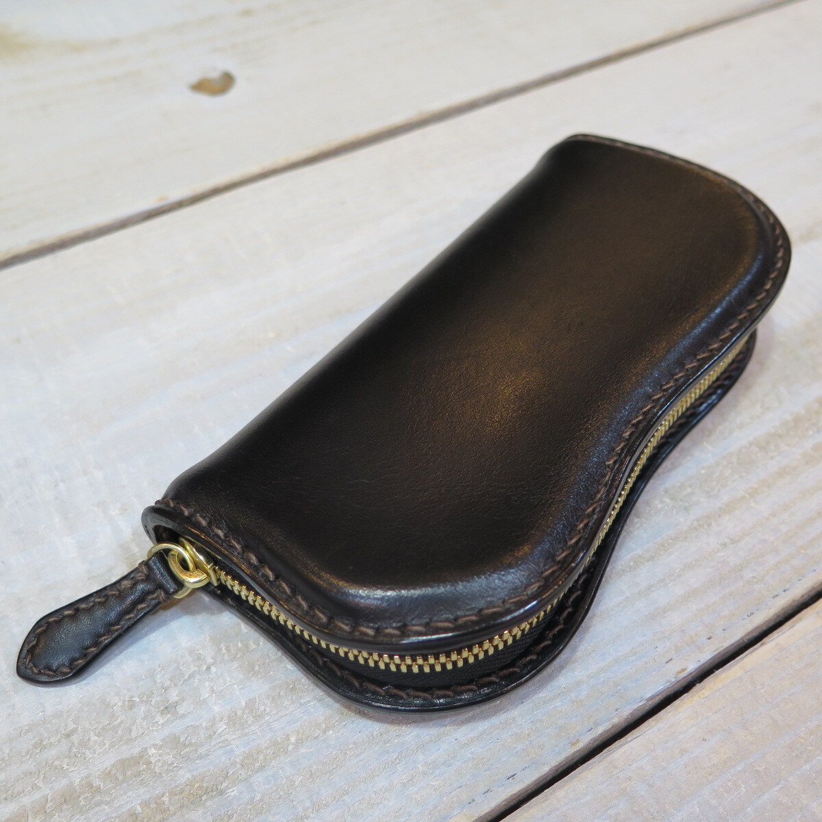 負荷のかかりやすい部分は多脂革と一部豚革を貼り合わせ、補強を行うなど、見えない部分にもこだわって丁寧に仕上げたハンドメイドアクセサリーケース。
