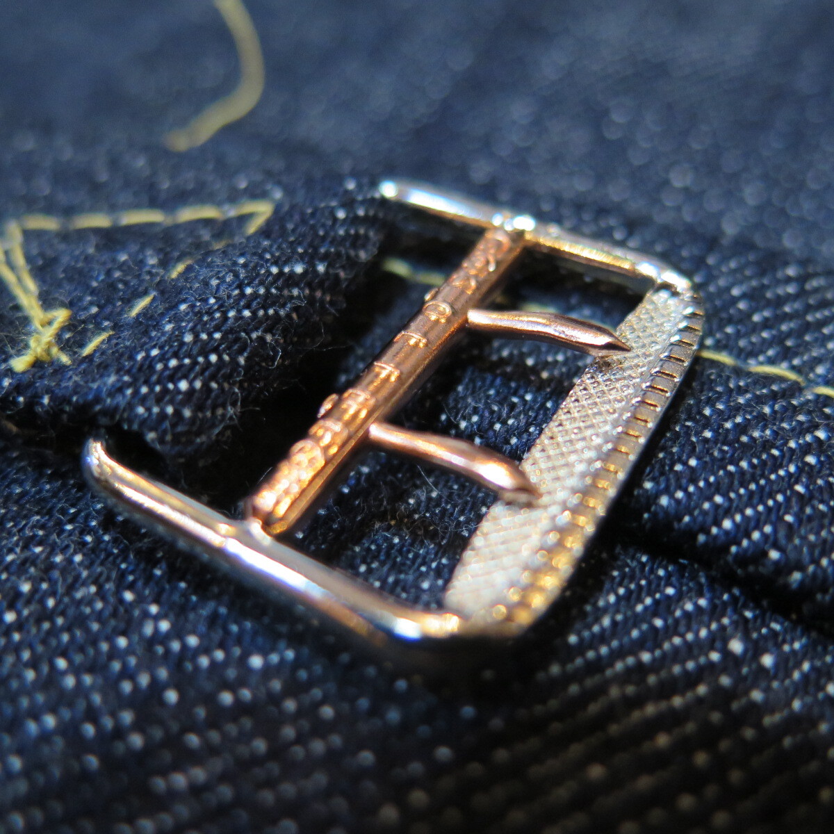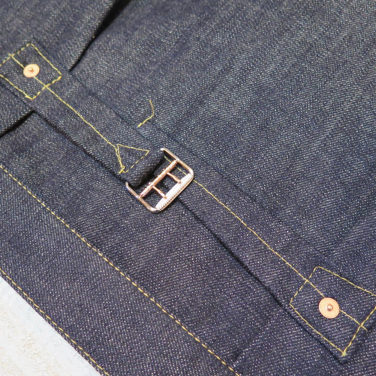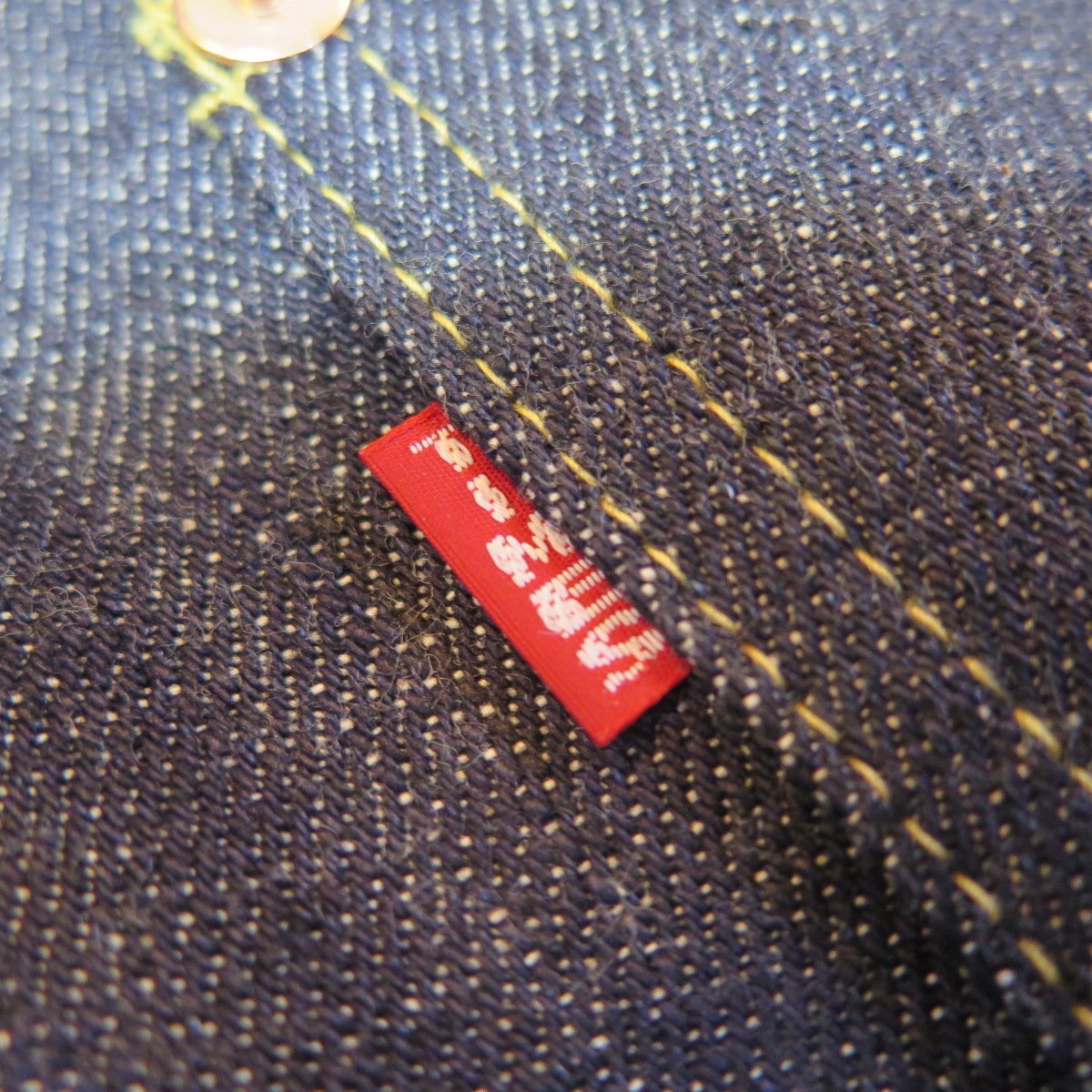乱れた縫製・鉄製月桂樹ボタン(打痕跡ツープロング)・刻印無しリベット・レザーパッチ・赤タブ・ヤスリバックル